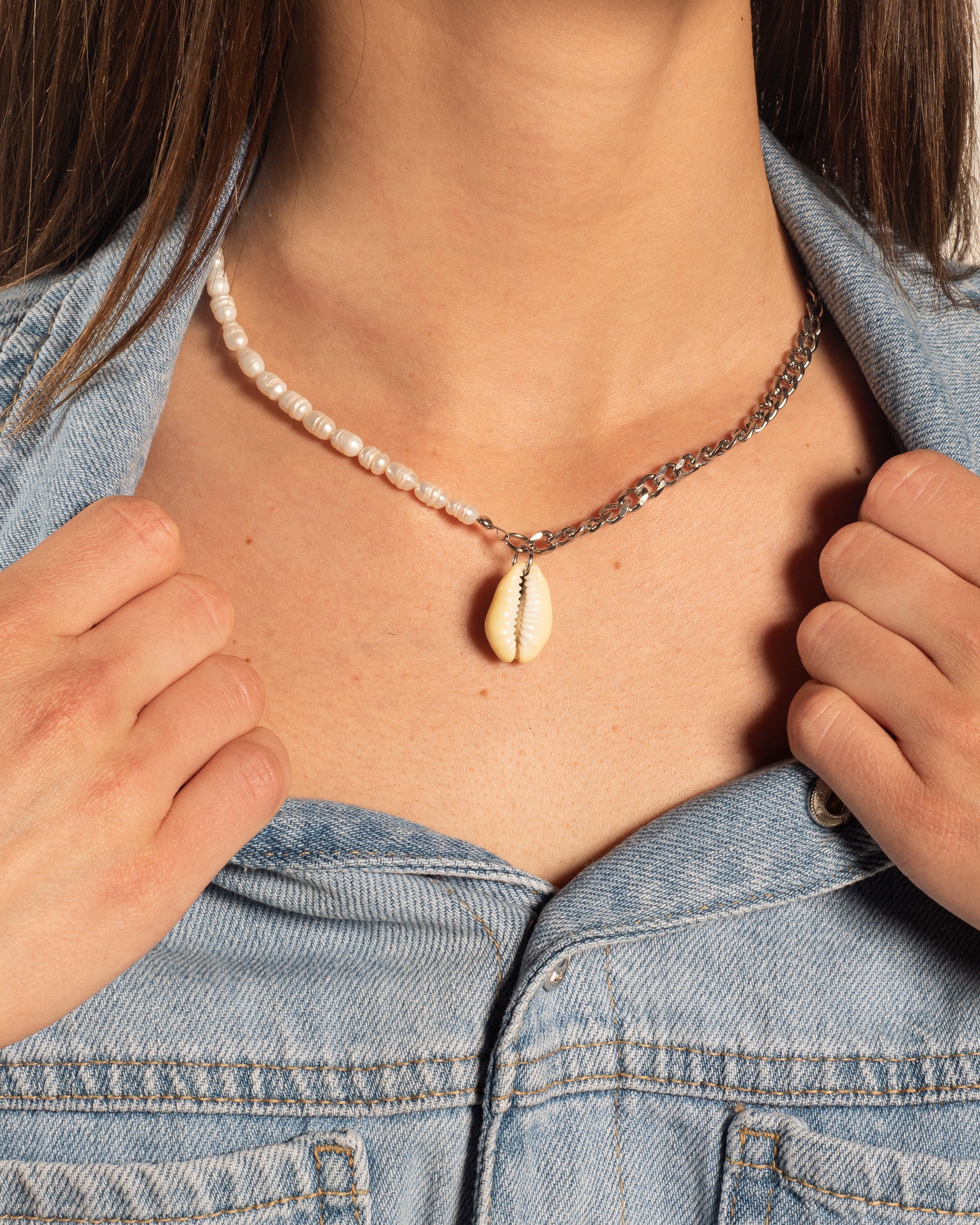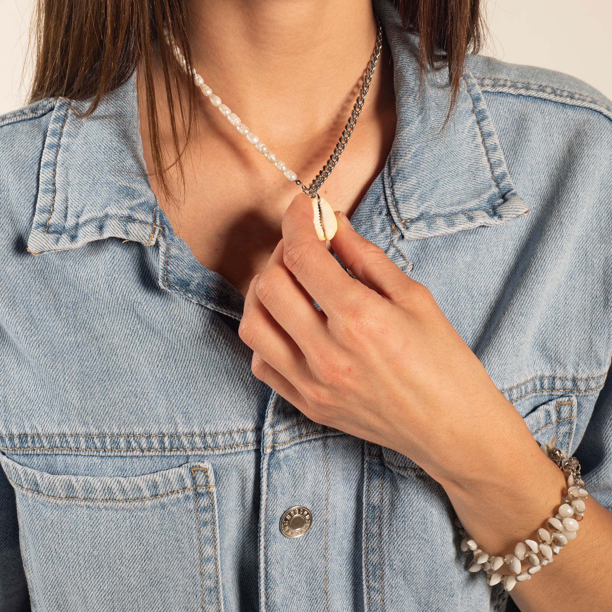 Matières : coquillage, perles d'eau douce, acier inoxydable.