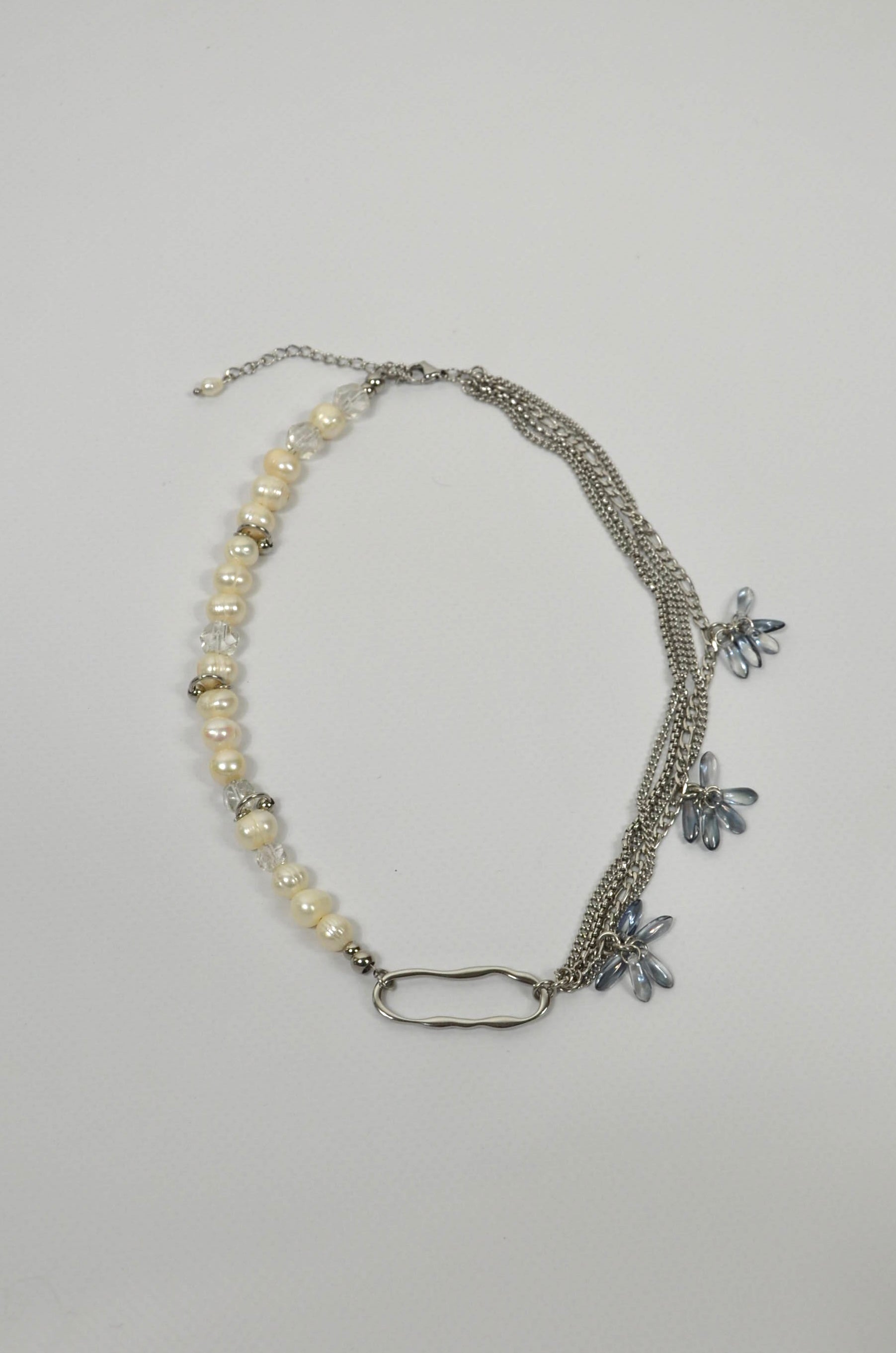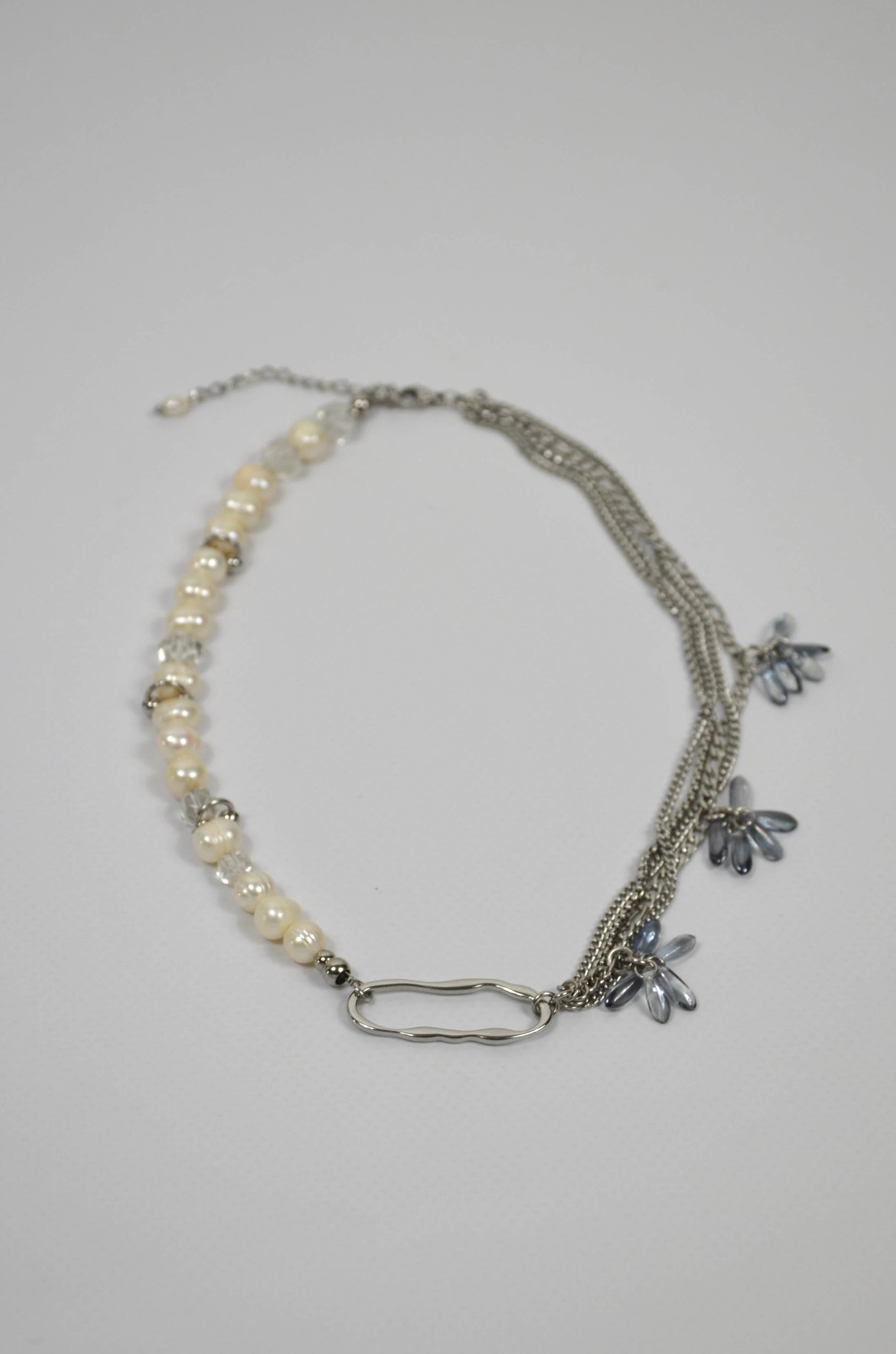 Matières : acier inoxydable, verre et perle d'eau douce.