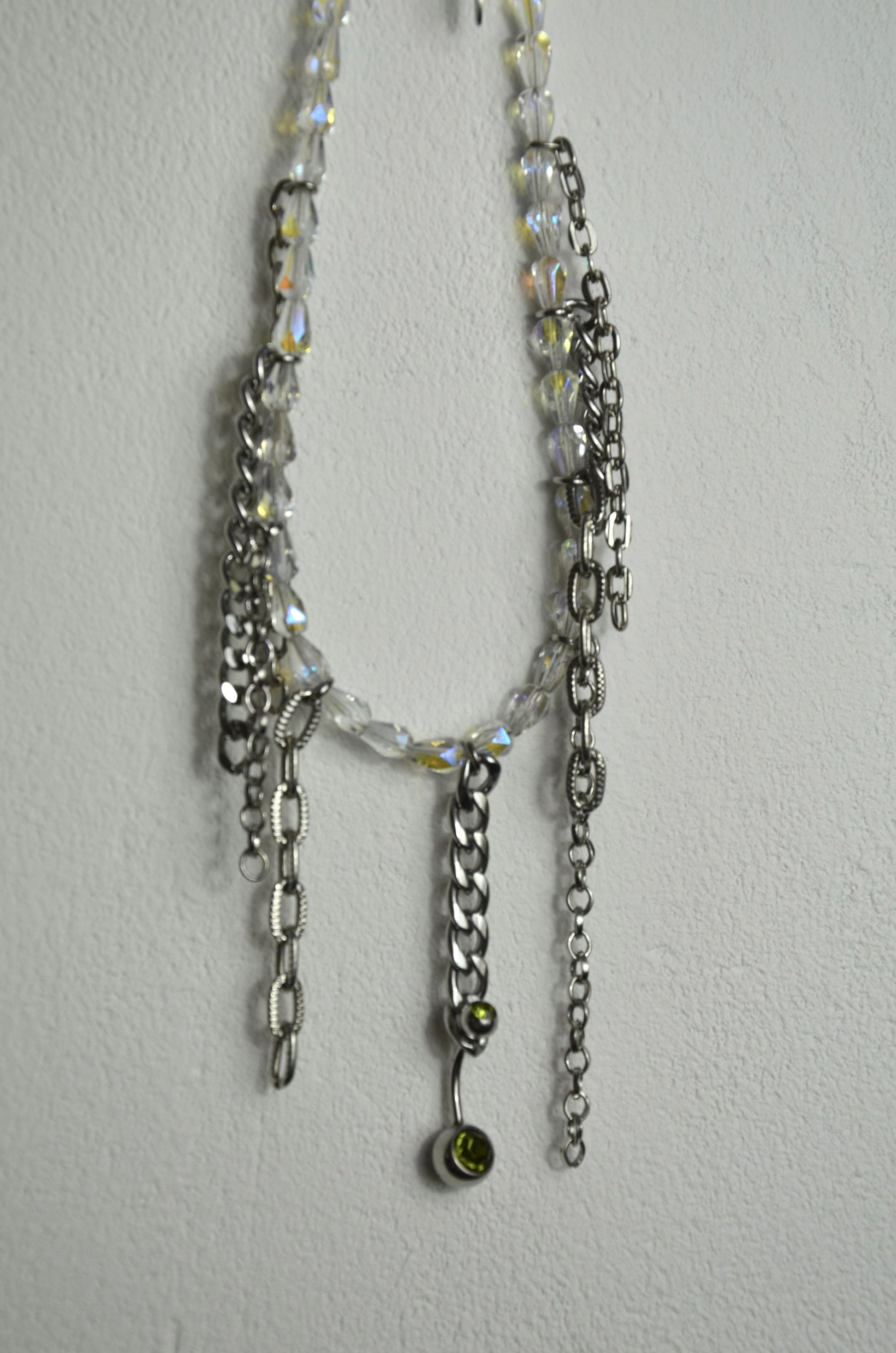 C'est une pièce unique fabriquée à la main dans le sud de la France. Elle est composée de perles, chaînes et piercing upcyclés.