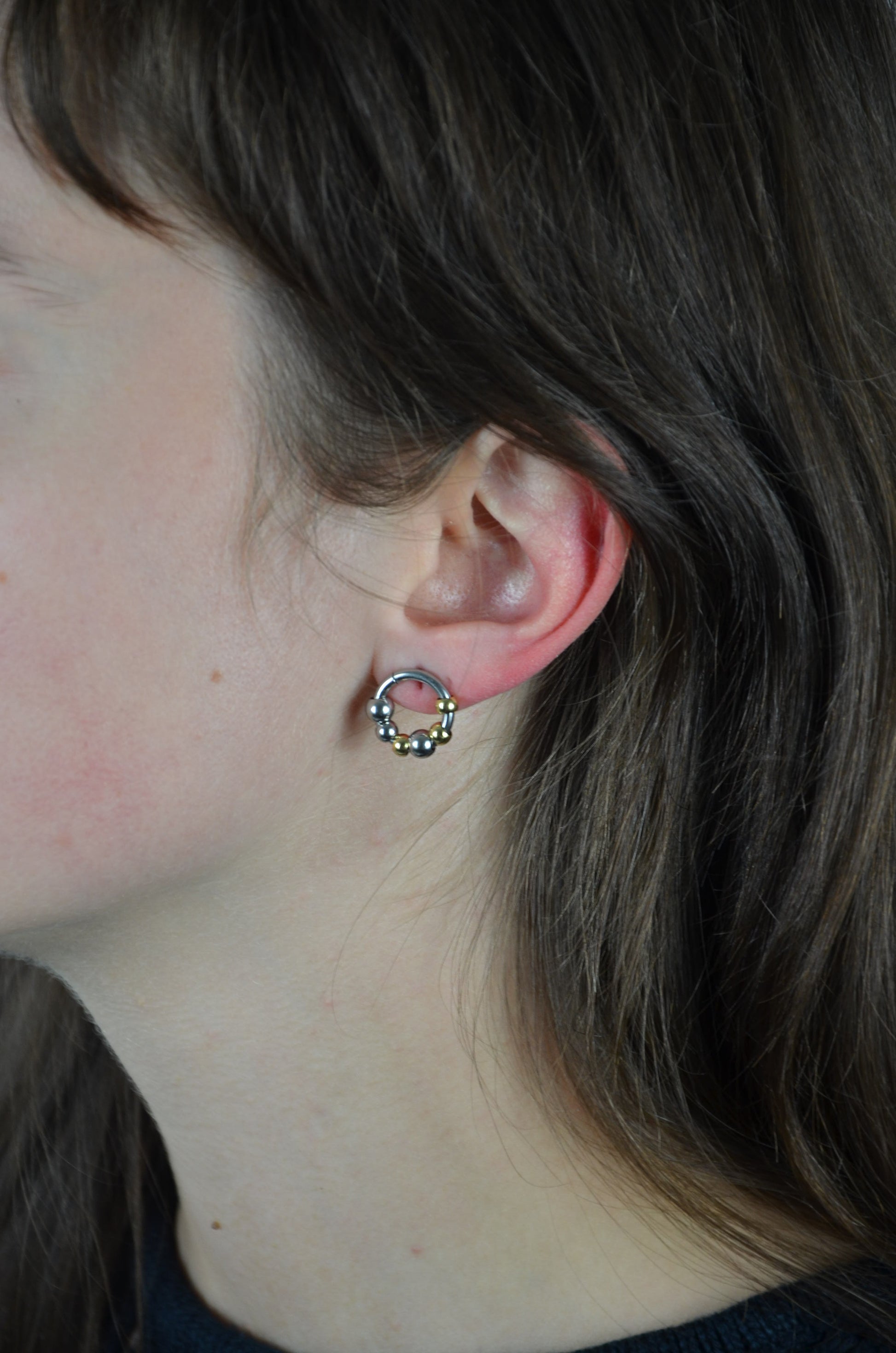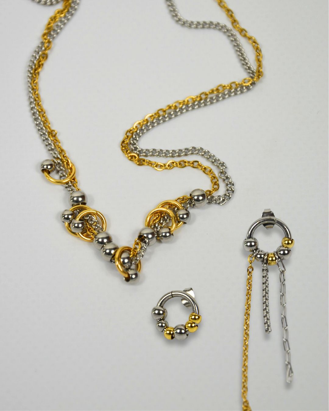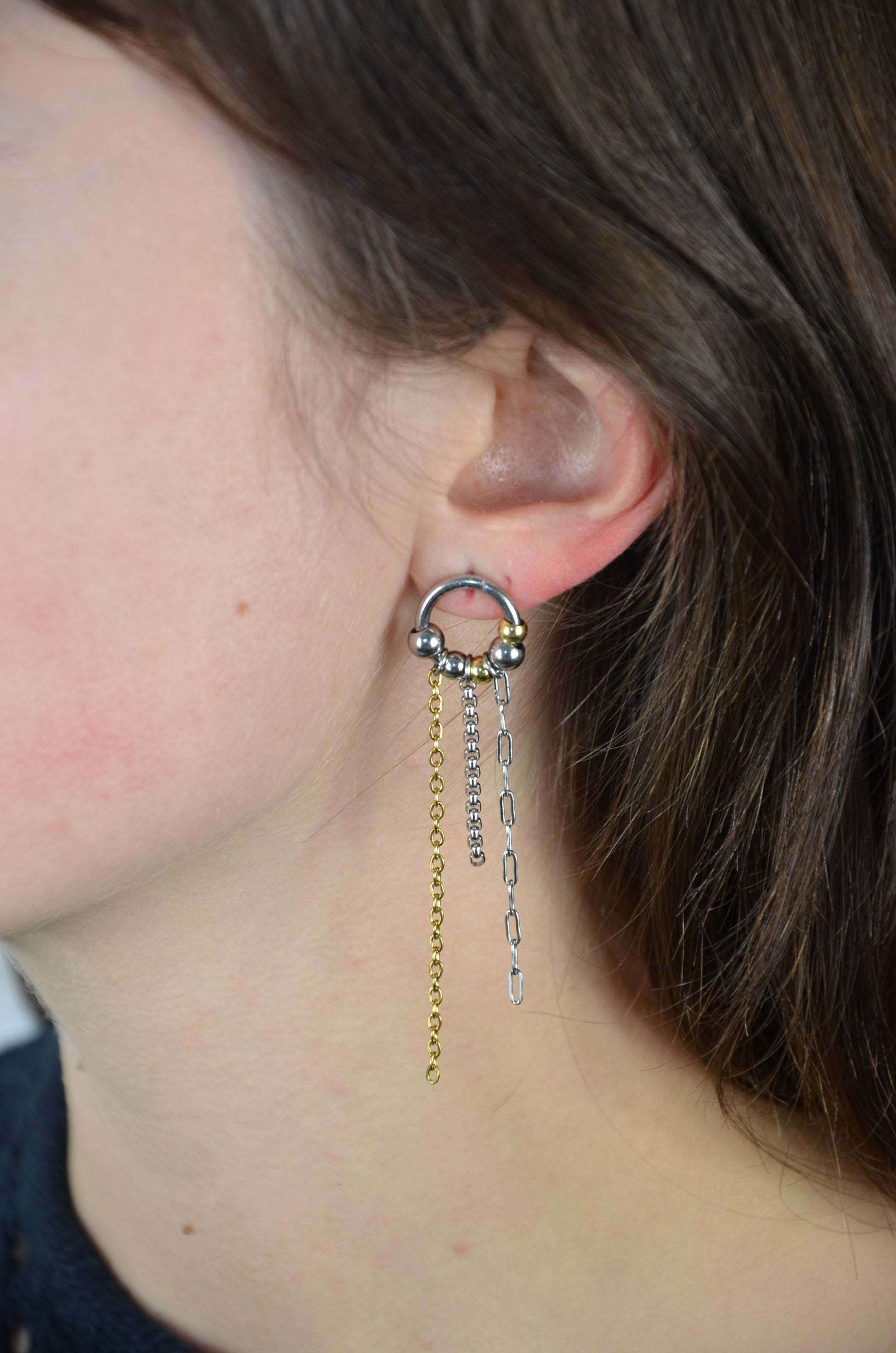 Cette parure est composée d'un collier et d'une paire de boucles d'oreilles assemblés à la main. Pièces en série limitée. (3 produits : collier Halo, 2 mono-boucles Halo : 1 longue et 1 courte)