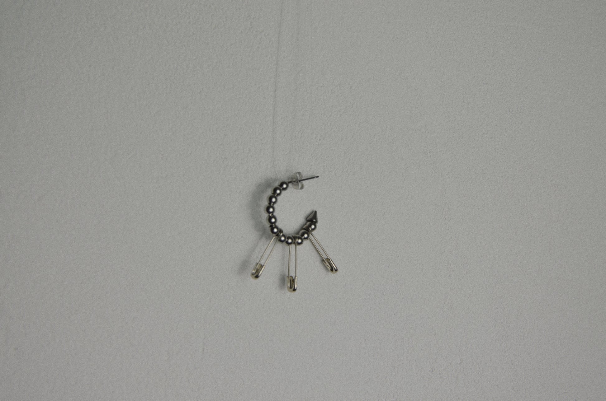 La mono-boucle Épingle est une pièce fabriquée à la main dans le sud de la France. Elle est disponible en série très limitée. Elle est composée d'épingles de seconde main et de perles en acier inoxydable.