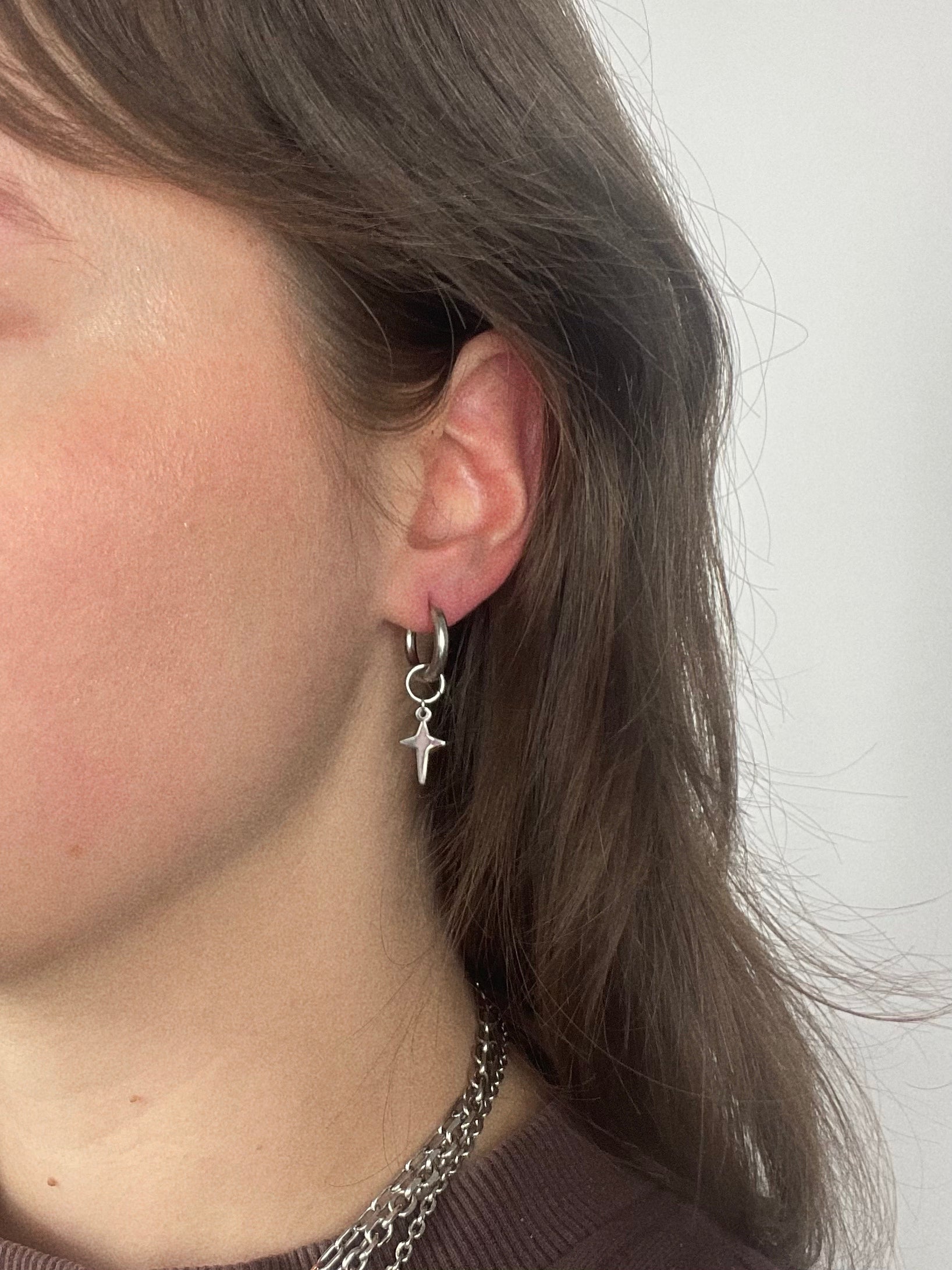 Matières : acier inoxydable, métal argenté (étoile), perle d'eau douce, perle en verre.