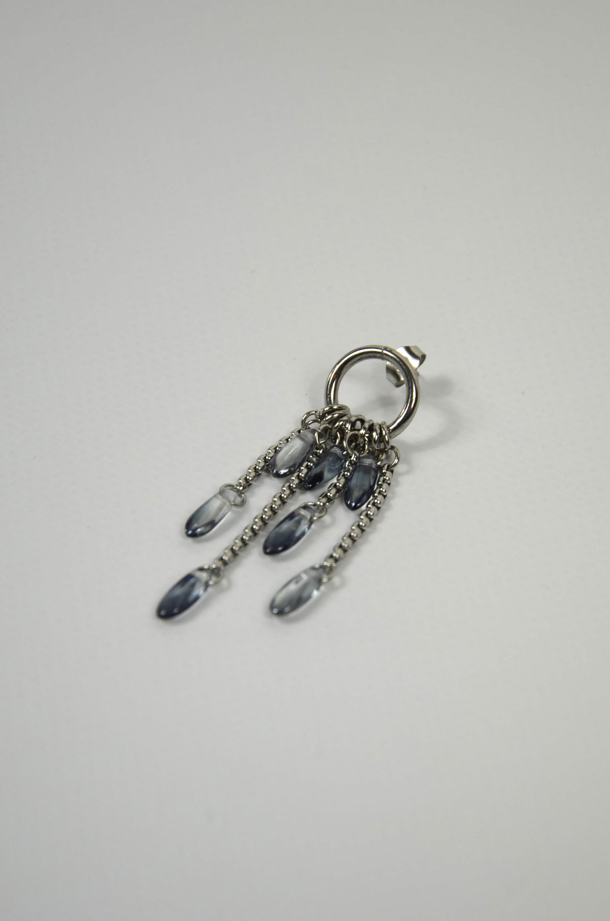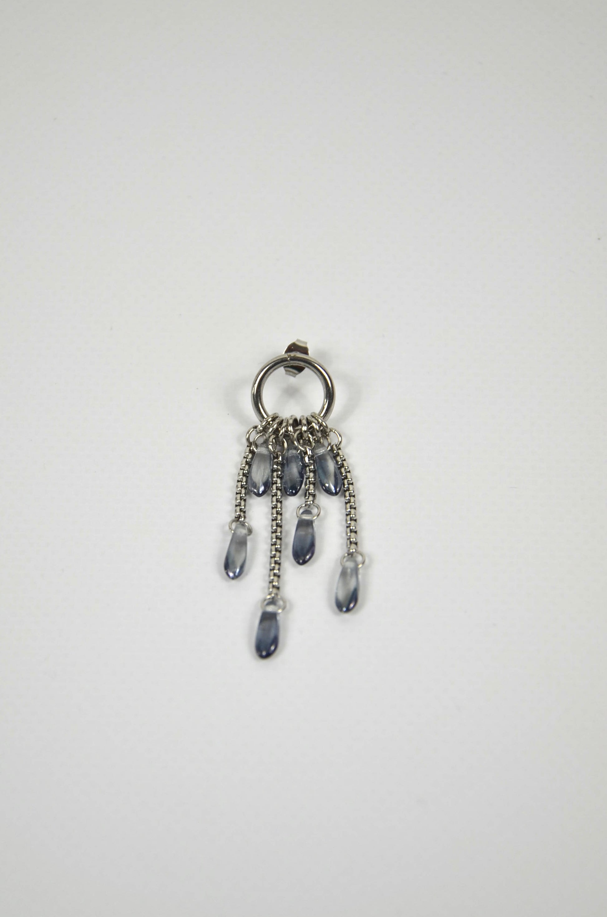 La mono-boucle Pluie fine est assemblée à la main dans le sud de la France. Elle est fabriquée à partir de perles en verre de seconde main. Disponible en série très limitée.