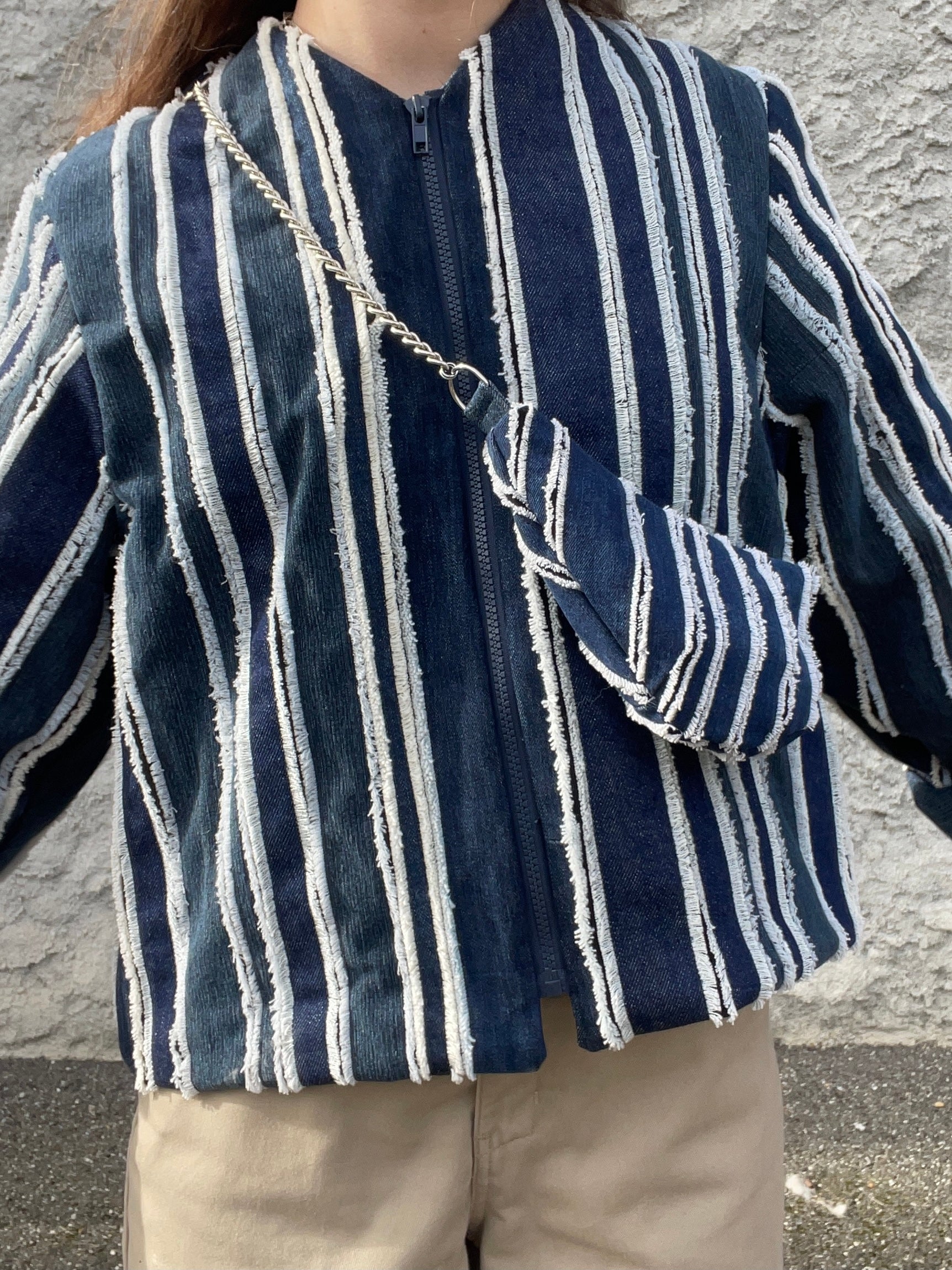 Le sac Maël est une pièce unique fabriquée à partir d'un jean de seconde main. Chaque bande a été cousue et effilochée à la main. Les apprêts et la fermeture à glissière sont neufs.