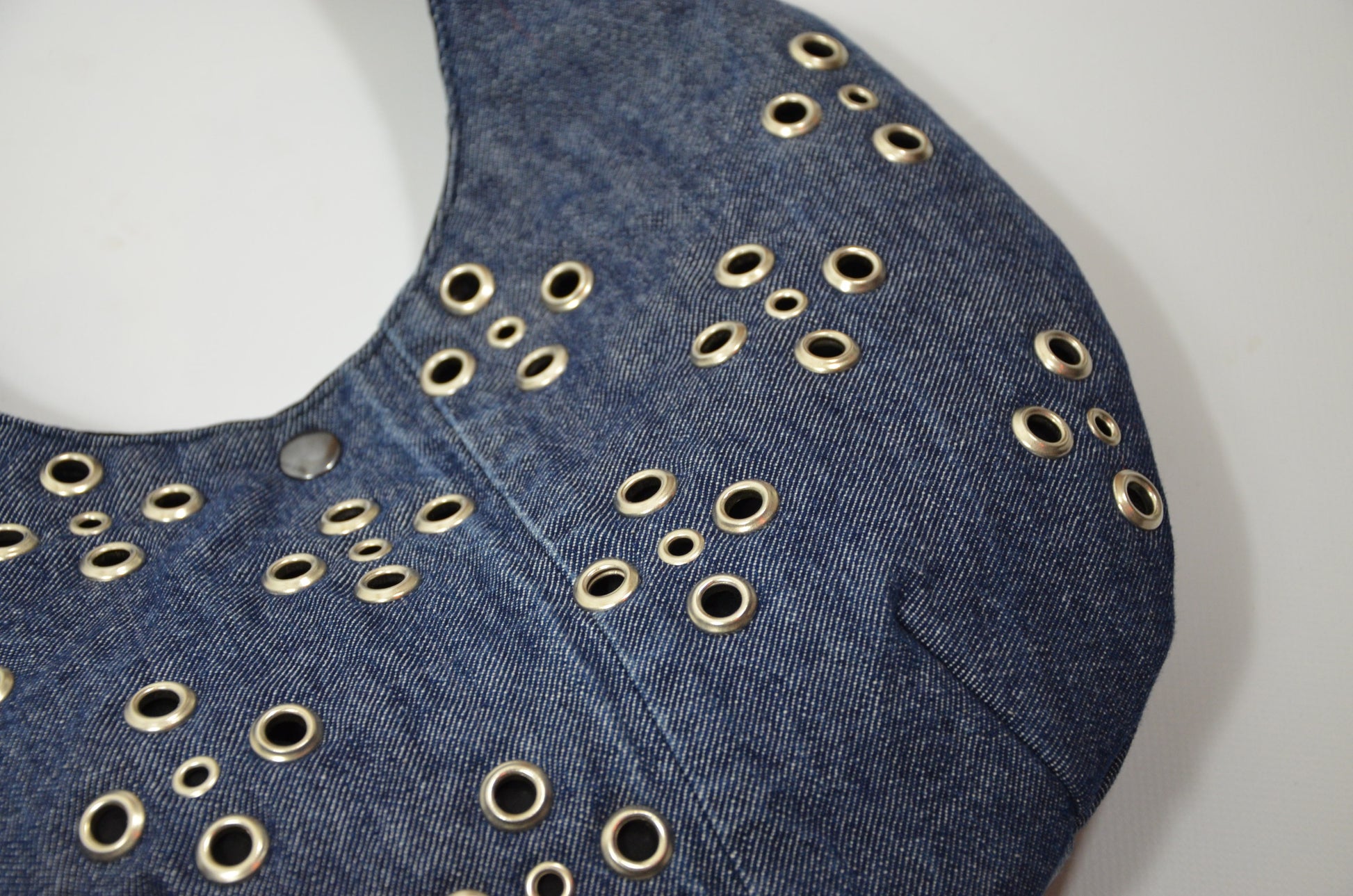 Matières : Jean : coton, élasthanne. Œillets et pression : métal argenté. Doublure : 100% coton.