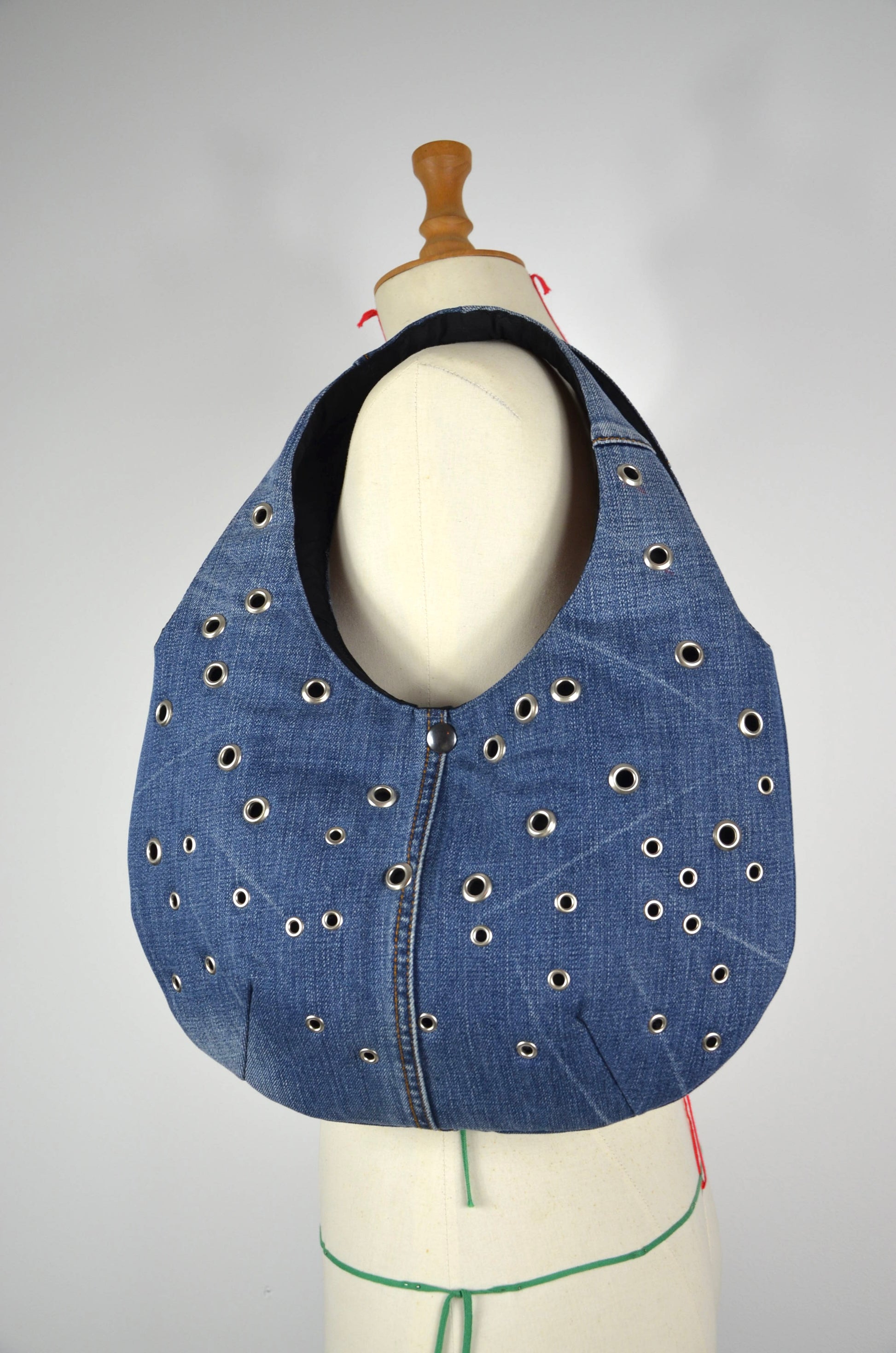Le sac Trypophobia est une pièce unique, fabriquée à partir d’oeillets et de jean de seconde main.