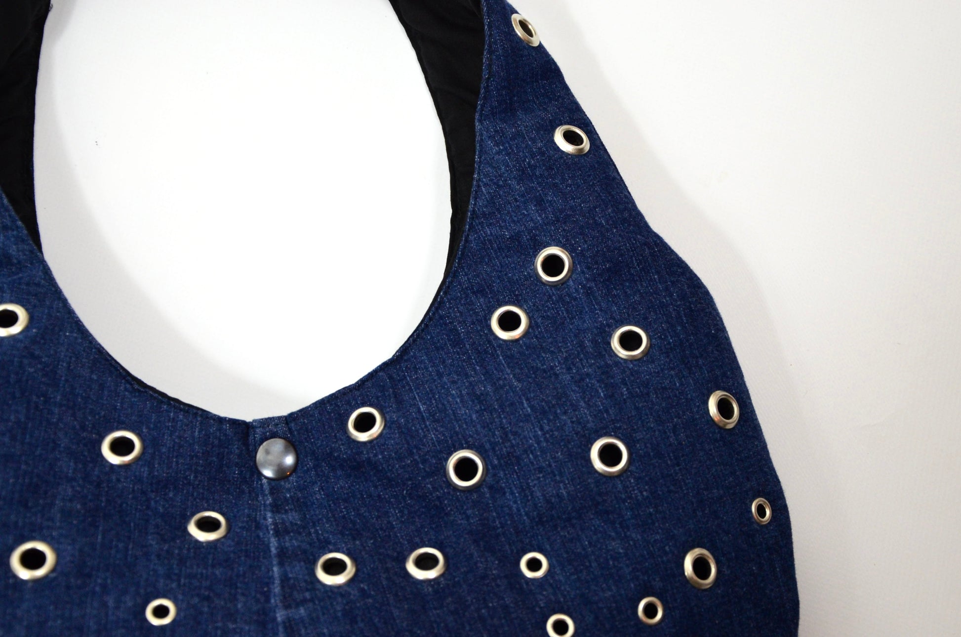 Le sac Trypophobia est une pièce unique, fabriquée à partir d’oeillets et de jean de seconde main.