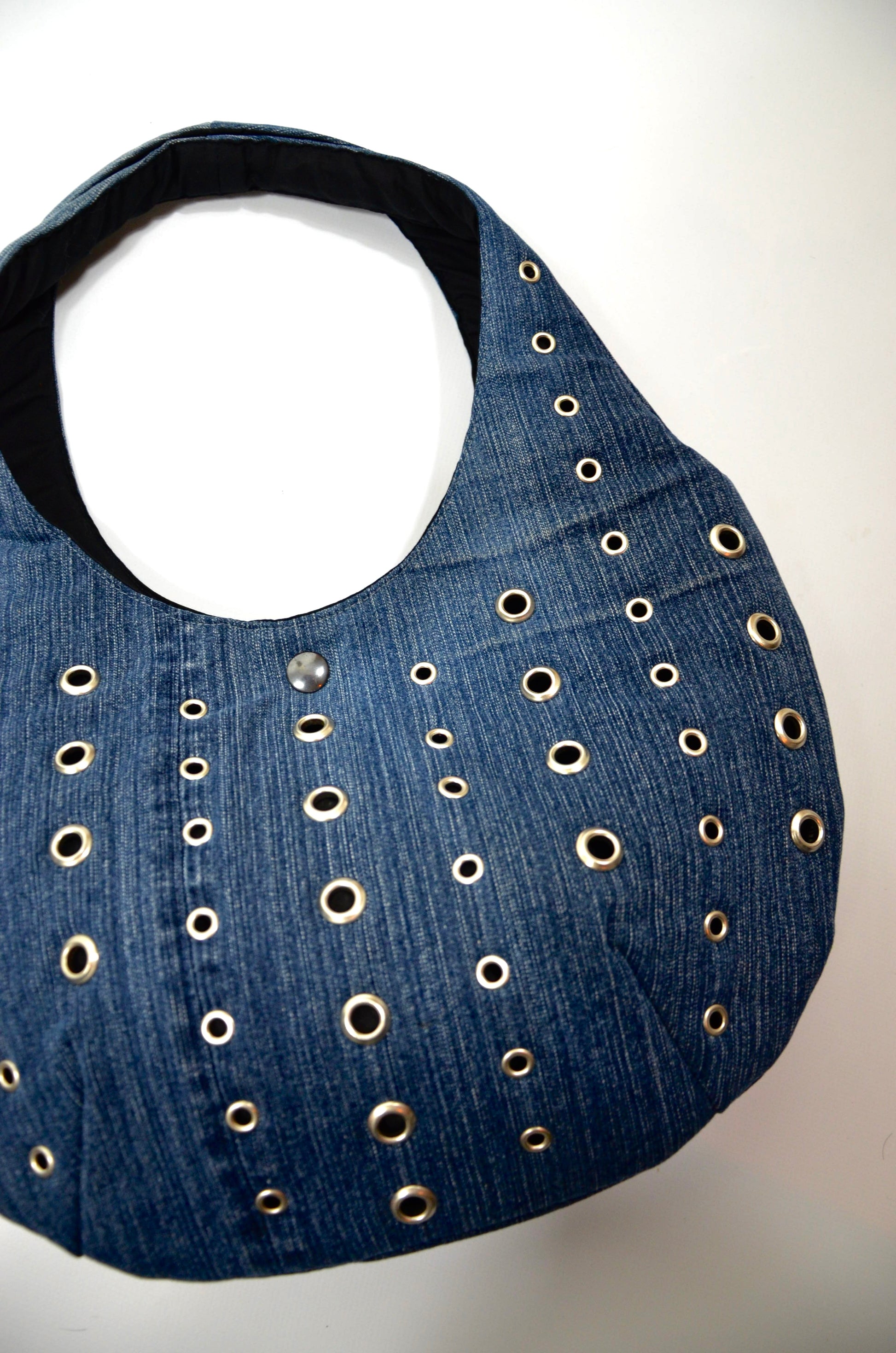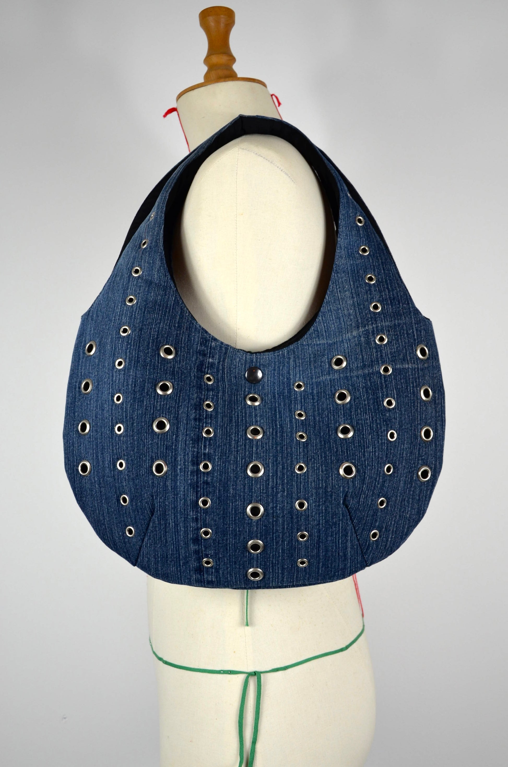 Le sac Rayures est une pièce unique, fabriquée à partir d’oeillets et de jean de seconde main.