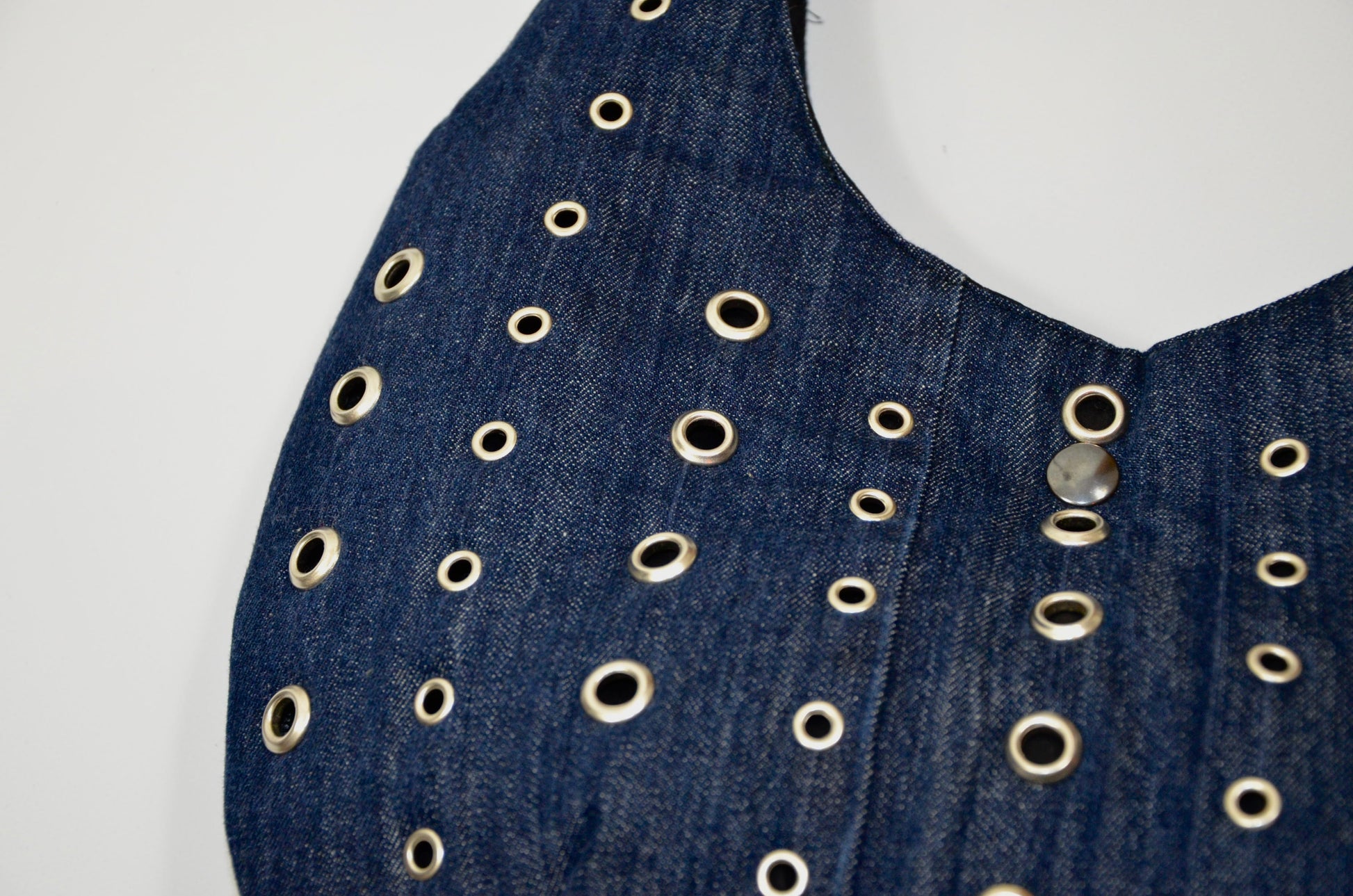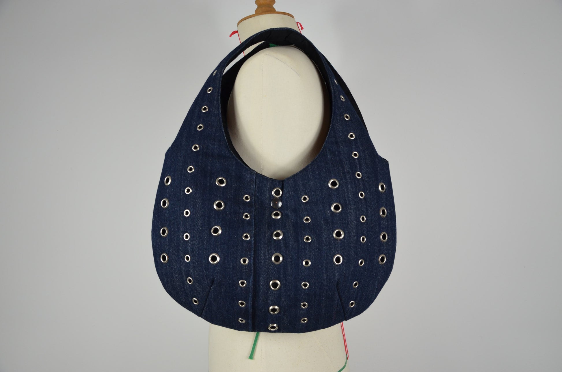 Le sac Rayures est une pièce unique, fabriquée à partir d’oeillets et de jean de seconde main.
