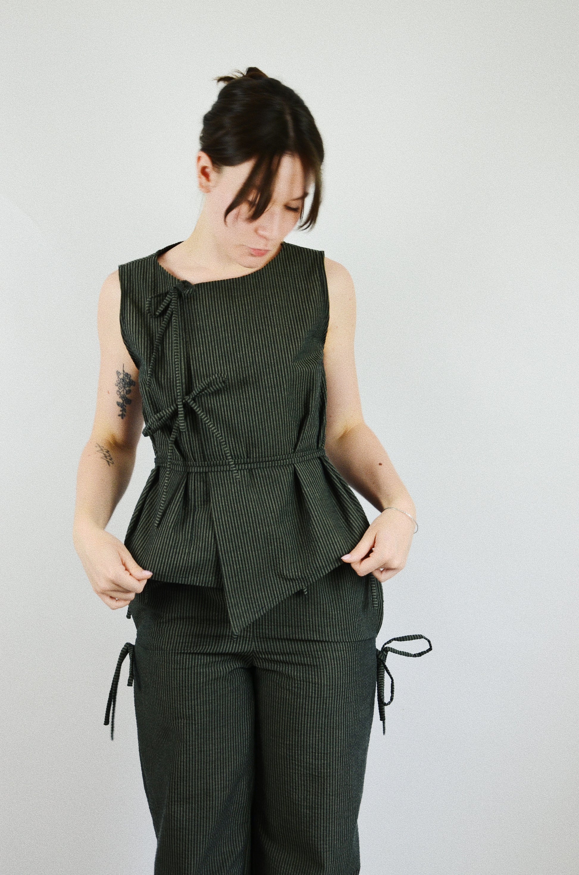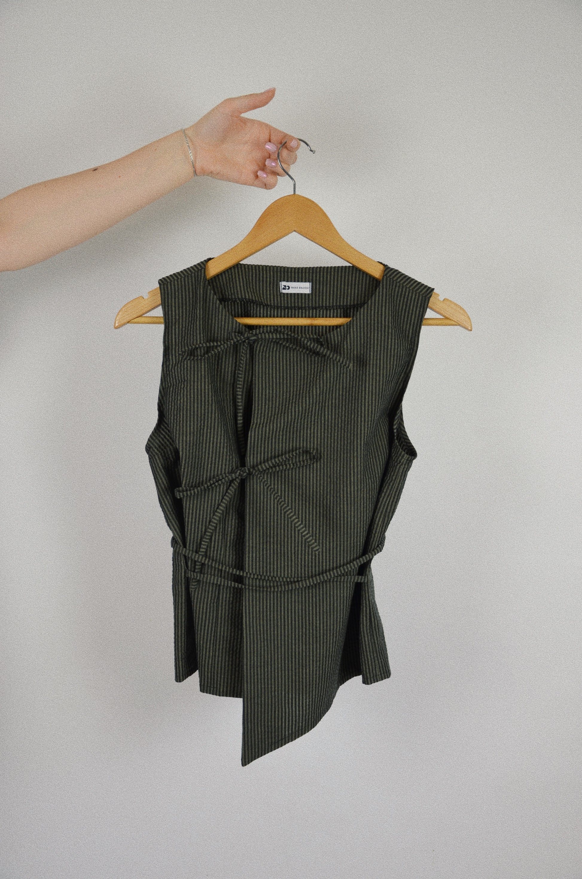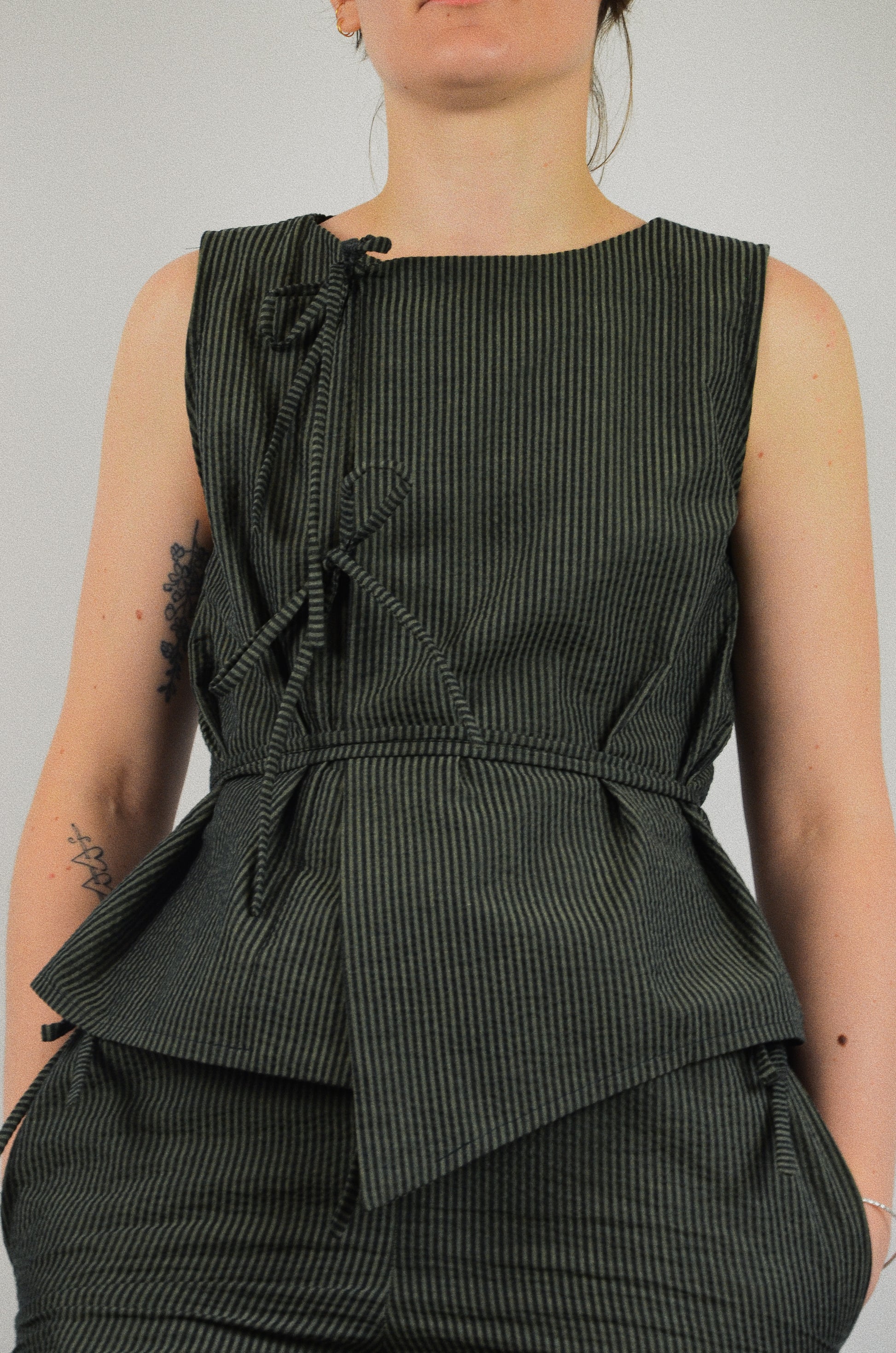 Le top Noué est une pièce cousue à la main dans le sud de la France. Il est disponible en série très limitée. Son tissu provient d'un stock dormant, ce qui permet de limiter la surproduction de matières et de réemployer du textile déjà existant.