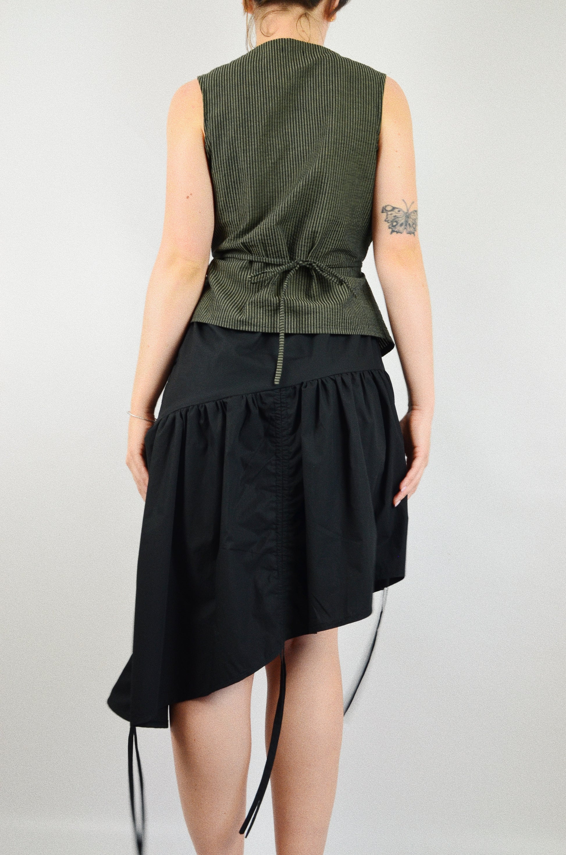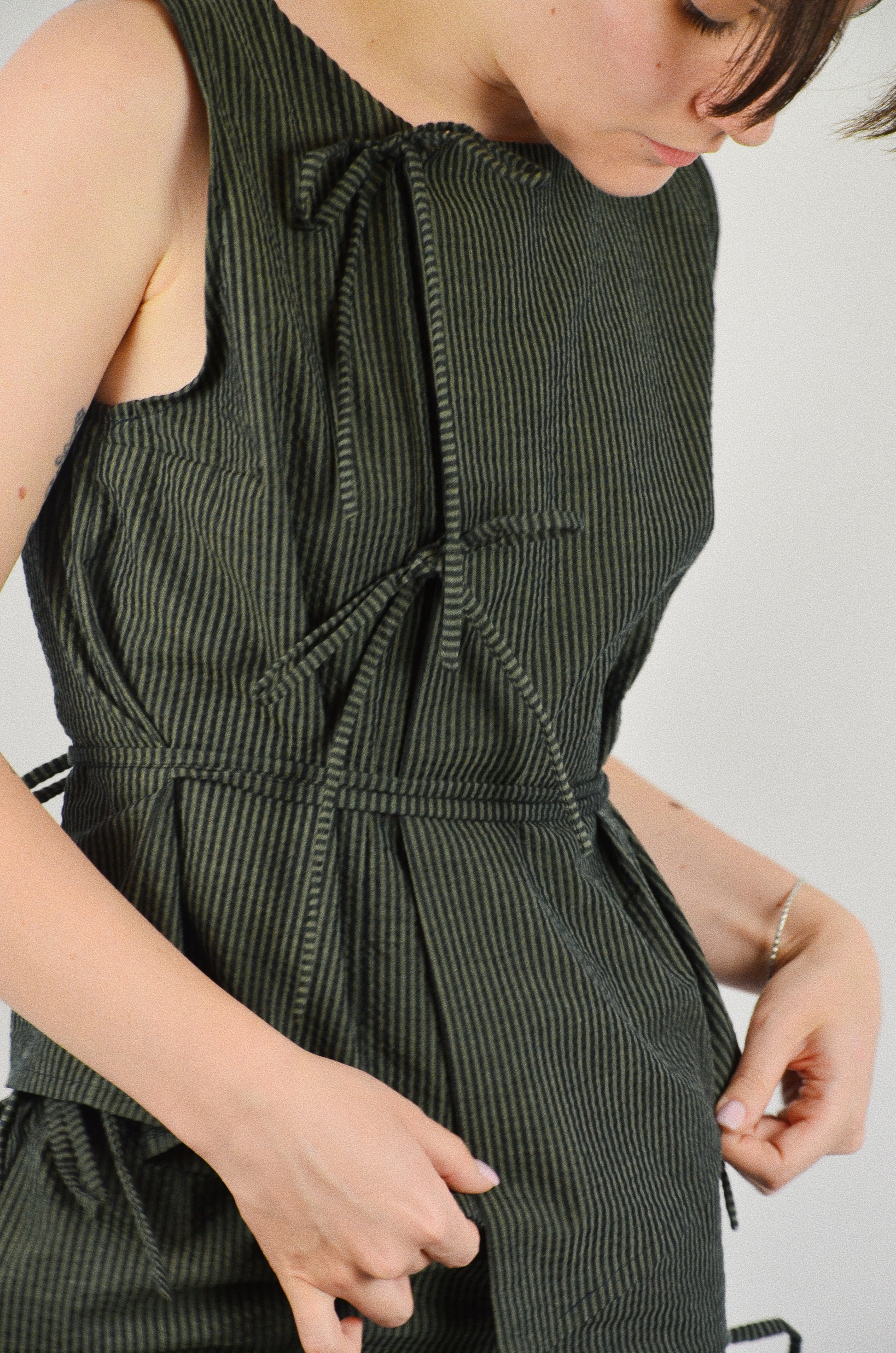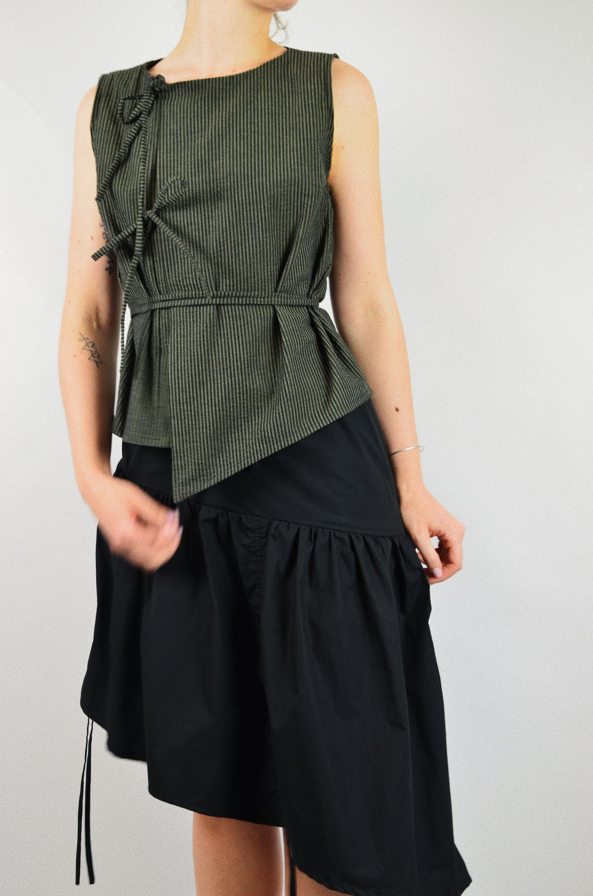 Le top Noué est une pièce cousue à la main dans le sud de la France. Il est disponible en série très limitée. Son tissu provient d'un stock dormant, ce qui permet de limiter la surproduction de matières et de réemployer du textile déjà existant.